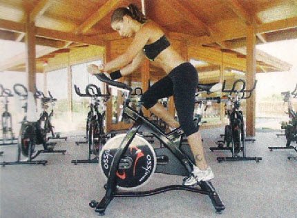 3 – A posição mais exigente, que é utilizada nos momentos mais intensos da aula. E necessária coordenação e equilíbrio postural. De pé, mãos afastadas à largura dos ombros seguram as pegas dianteiras do guiador. Os braços ficam em rotação externa e o tronco inclinado sobre o guiador, com a bacia um pouco avançada em relação ao selim.