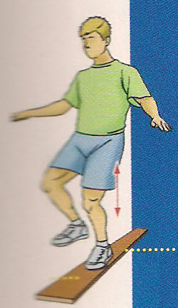 Coloque-se em equilíbrio numa perna sobre uma tábua, por exemplo de 5 cm de altura X 10 cm de largura aproximadamente. Mantenha as costas direitas, o olhar em frente flectindo lentamente o joelho baixando o corpo tanto quanto possível sem sair fora da tábua. Com este exercício trabalha-se muito o equilíbrio e a força.